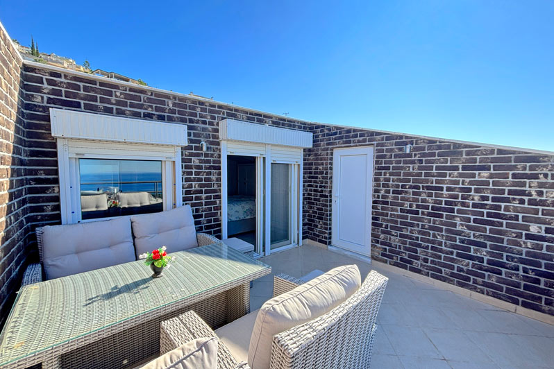 This lovely fully furnished property is in a prime position with an outlook to the coastline. It offers 132m2 of bright open plan space which has been perfectly designed to draw the eye through the length of the living area to the views beyond. There is a compact kitchen together with a spacious and welcoming dining room and lounge. Two sets of patio doors lead onto a wide balcony; the perfect retreat for relaxing, with windows to all sides. On this level, there is also a large guest bedroom and bathroom. A wrought iron staircase leads to the upper floor, where there are 2 double bedrooms tucked in the eaves and a luxurious bathroom. Doors from the master bedroom access a roof terrace - perfect for sunbathing and enjoying the panorama.