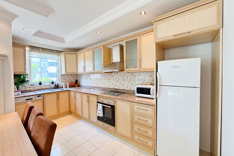 This beautifully furnished, 125m² property offers an ideal retreat, with a homely and relaxed feel. The substantial open-plan living room is bright and airy, with full-length windows and a large balcony that provides lovely views of the pool and garden. To the right of the room is a modern kitchen and dining area with patio doors, perfect for alfresco dining. The spacious hallway provides access to all the rooms, including a guest bathroom. There are also two double bedrooms, the larger of which has balcony access and private en-suite facilities.