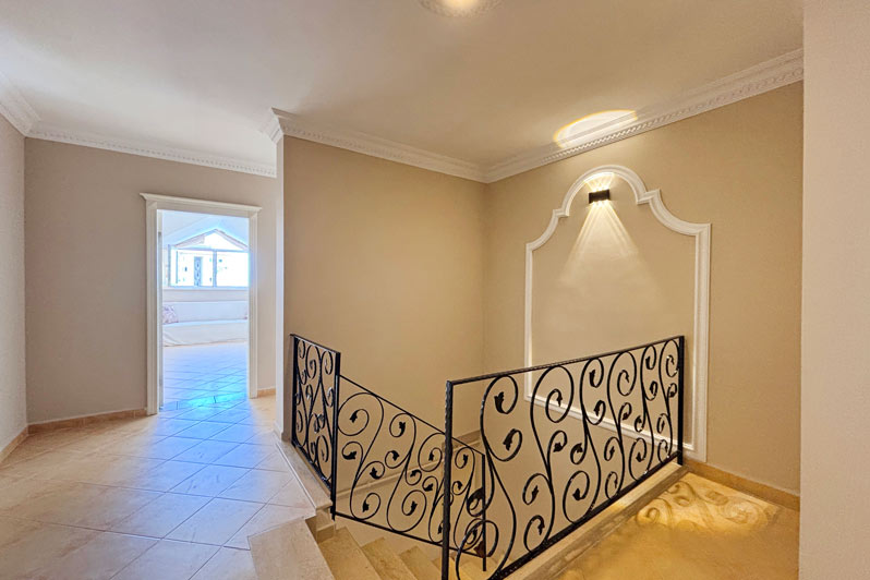 Also on this lower level is a double guest bedroom, a separate sitting room with access to a small balcony, and a beautifully tiled bathroom. A marble staircase from the hall leads to the upper floor, which features 3 additional double bedrooms and a beautiful family bathroom. The master bedroom is an impressive size and opens onto a fabulous roof terrace.